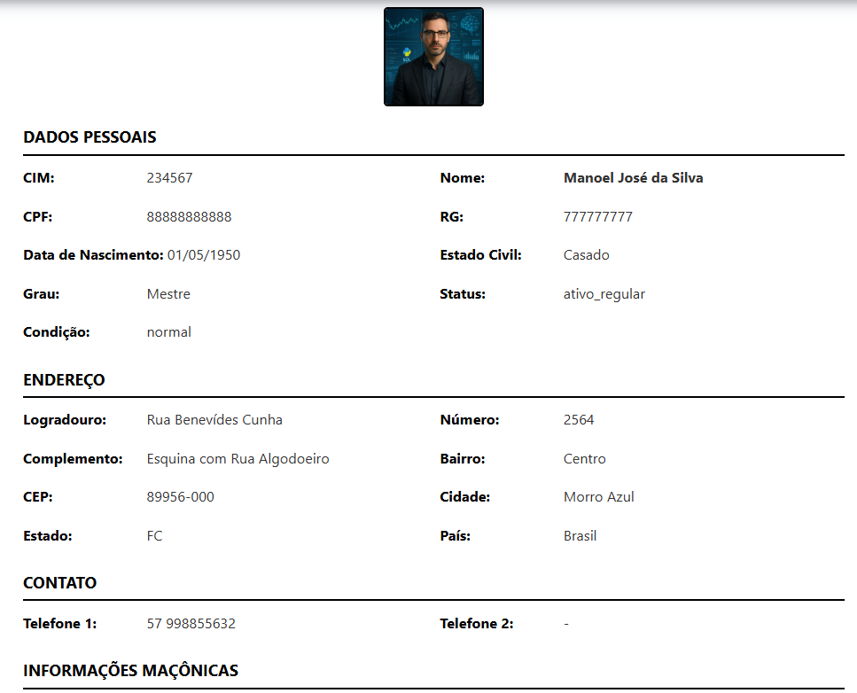 Com acesso ao próprio histórico completo, incluindo presenças em sessões, cargos ocupados e obrigações financeiras, o obreiro tem autonomia para acompanhar sua trajetória na Loja. O portal é totalmente responsivo, funcionando perfeitamente em dispositivos móveis, tablets e desktops.