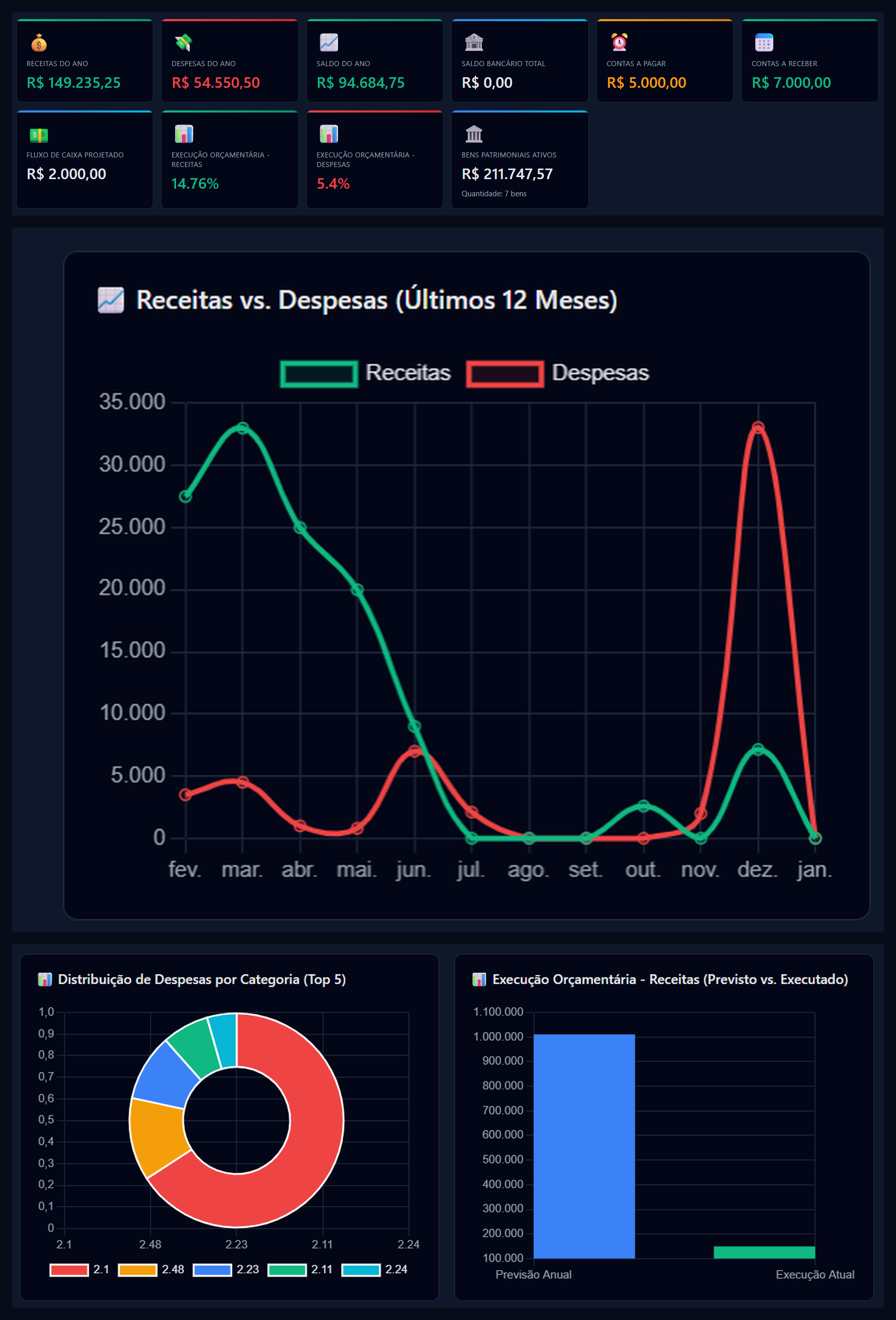 Mantenha o inventário completo de bens patrimoniais com valores de aquisição e atual, depreciação e localização. O dashboard financeiro oferece KPIs em tempo real, gráficos interativos e relatórios exportáveis, proporcionando visão estratégica completa da saúde financeira da Loja.